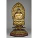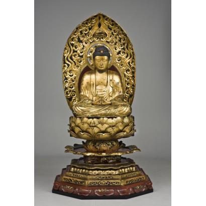 Figure of Amida of the jōbon jōhin realm of rebirth, seated on a lotus pedestal with mandorla.